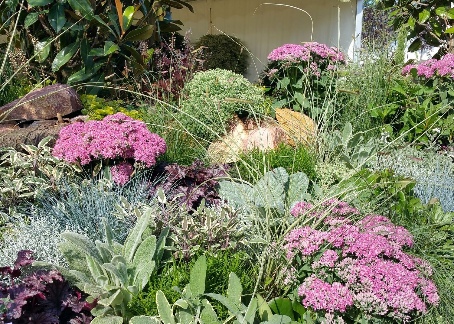 Leuchtende Spätblüher wie Astern, Chrysanthemen, Sommerheide (Callune), Alpen- und Hornveilchen prägen den Garten und die Terrasse im September und Oktober. Ein wichtiges Element sind natürlich die dekorativen Ziergräser wie das Federborstengras oder das rote Blutgras. Auch die pflegeleichten Sedumsorten haben ihren festen Platz im aktuellen Herbstprogramm. Blattschmuckstauden wie die Heuchera mit ihren farblich sehr unterschiedlichen Blättern gehören ebenfalls fest zum Sortiment.