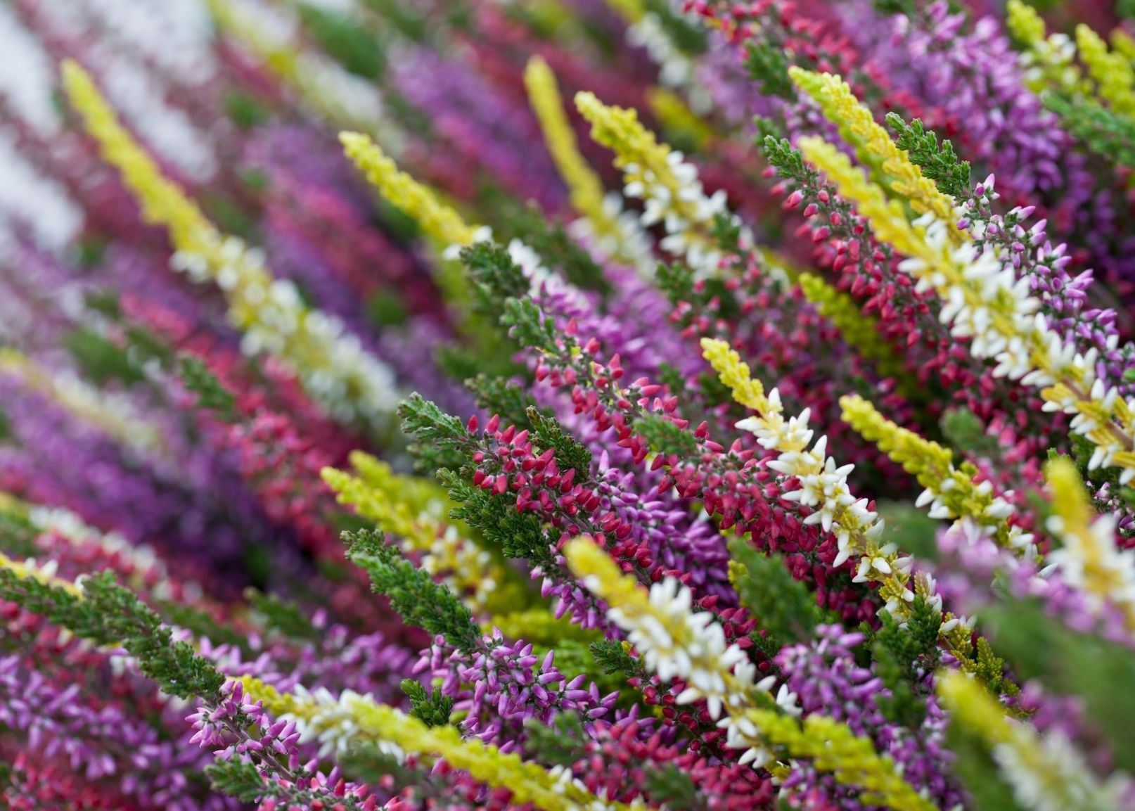 Leuchtende Spätblüher wie Astern, Chrysanthemen, Sommerheide (Callune), Alpen- und Hornveilchen prägen den Garten und die Terrasse im September und Oktober. Ein wichtiges Element sind natürlich die dekorativen Ziergräser wie das Federborstengras oder das rote Blutgras. Auch die pflegeleichten Sedumsorten haben ihren festen Platz im aktuellen Herbstprogramm. Blattschmuckstauden wie die Heuchera mit ihren farblich sehr unterschiedlichen Blättern gehören ebenfalls fest zum Sortiment.